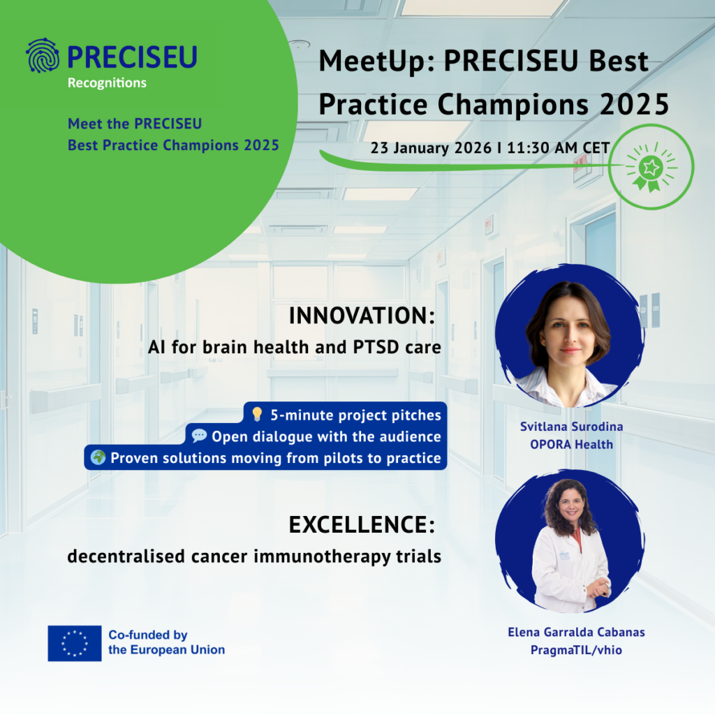 On 22 and 23 January 2026, PRECISEU hosted two online MeetUps bringing together the winners of the first edition of the PRECISEU Best Practice Recognition. These sessions offered the community a unique opportunity to hear directly from leading initiatives shaping the future of personalised medicine through health data, AI and patient-centred innovation. Across two discussions covering the IMPACT, CULTURE, INNOVATION and EXCELLENCE categories, speakers shared candid reflections on what it takes to translate promising research into real-world healthcare impact.
